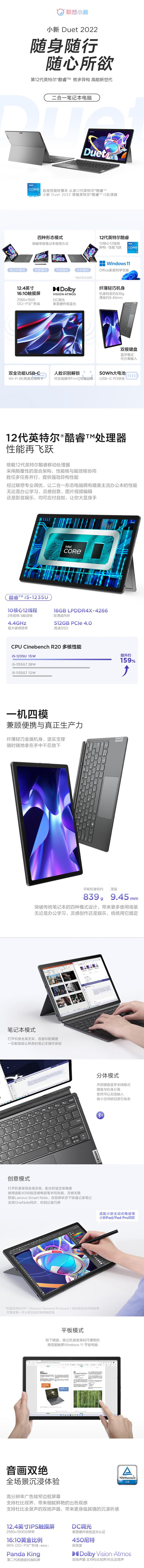 联想小新Duet笔记本电脑 2022款 12.4英寸全面屏二合一轻薄本学生游戏设计师手提办公平板电脑 12代酷睿i5-1235U 16G 512G固态