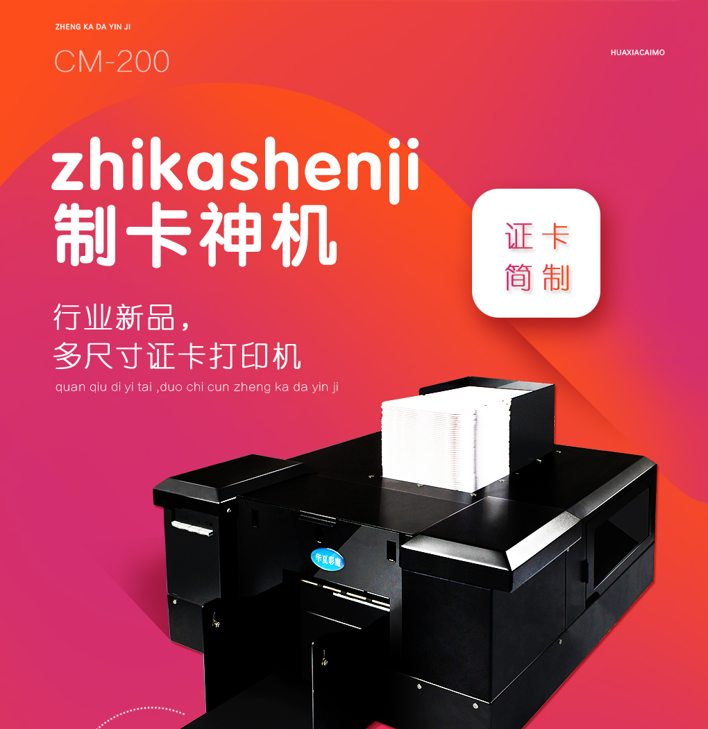 CM-200 证卡打印机是全球第一台多规格喷墨证卡打印机。该产品是目前全球市场上唯一一款可一机打四种尺寸的证卡打印机,拥有中国国家知识产权局颁发的“发明专利”和“实用新型专利”证书,被市场誉为“制卡神机”。